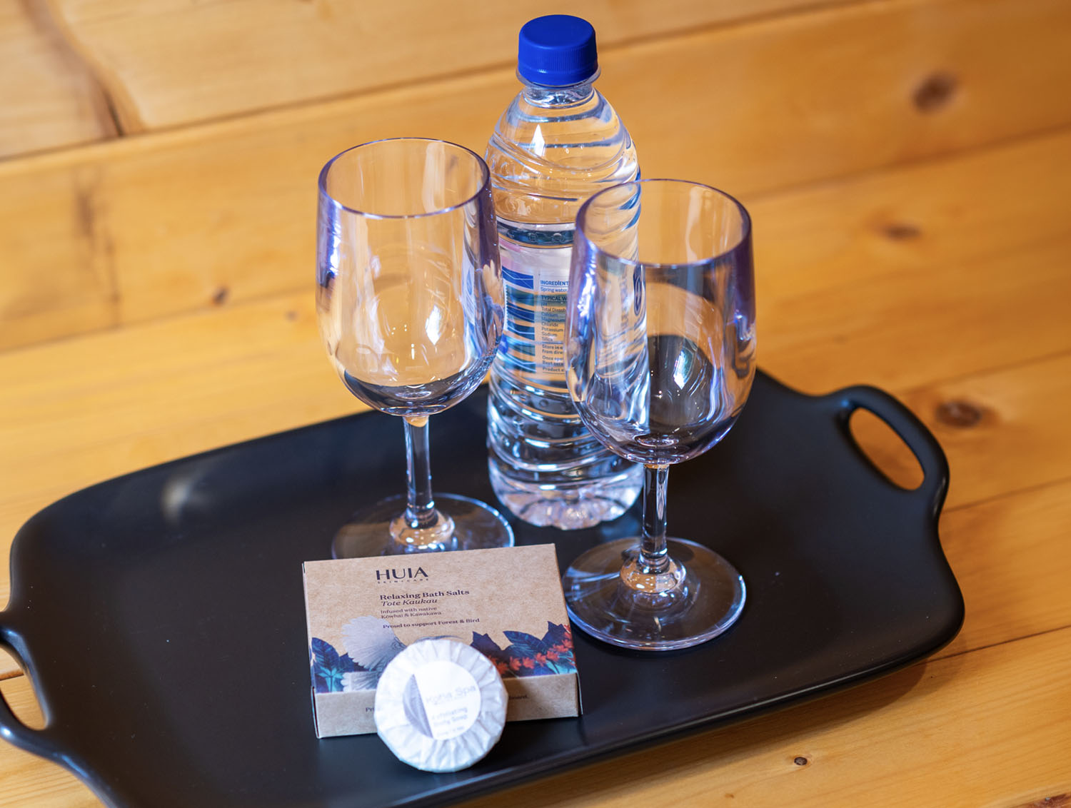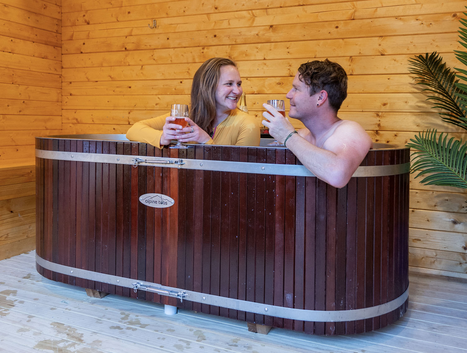 Your alpine bath fills in roughly 8 minutes, and both bath houses sit close to the park restrooms. They’re prepared with two fresh towels, two acrylic wine glasses, and a Bluetooth speaker – bring your phone to connect and set the mood!