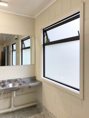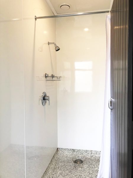 The Women’s bathroom has 2x modern shower cubicles, 3 toilets, 3 hand basins, large mirror, hairdryer and a hand dryer.